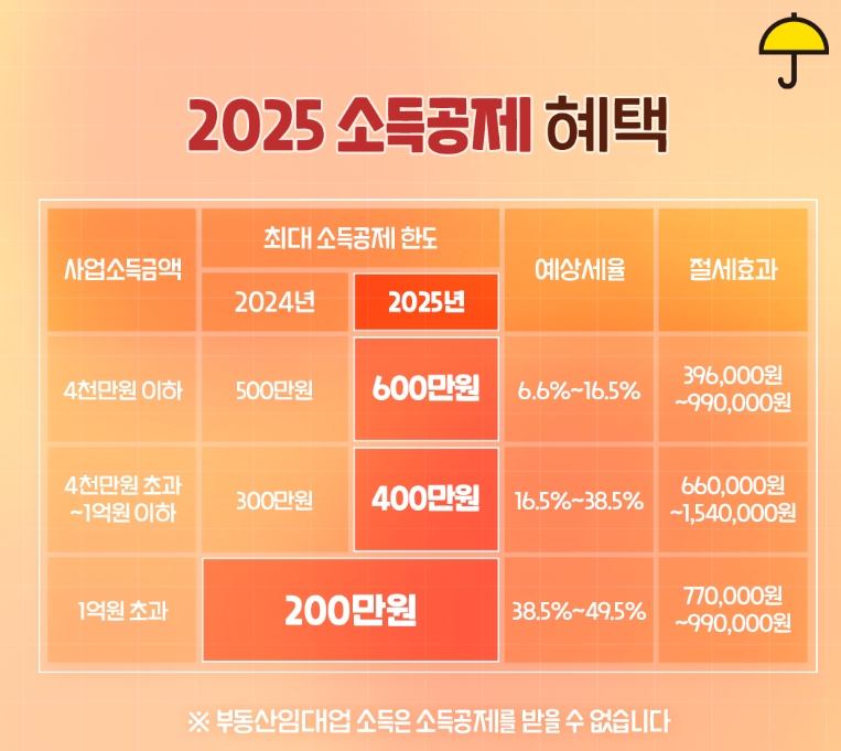 - 소득 4천만 원 이하 사업자: (기존) 500만 원 → (변경) 600만 원