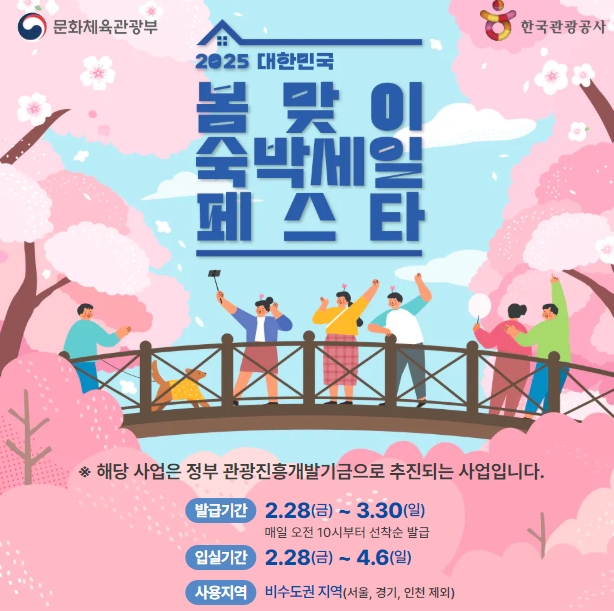 추운 겨울이 지나 따뜻한 봄이 오고 있습니다. 날씨가 풀리니 저도 자연스럽게 여행 생각이 나는데요, 문화체육관광부는 해외여행 수요를 국내로 유도하고, 휴가철에 집중된 여행 수요를 분산하기 위해 ‘여행 가는 달’ 행사를 운영하고 있습니다. 2025년에는 봄(3월), 여름(6월), 가을(10월) 총 3차례에 걸쳐 진행될 예정인데요. '여행 가는 달' 행사에서는 교통(철도, 항공, 렌터카) 할인, 놀거리 혜택(지역 여행 상품 특별 할인 및 이벤트), 그리고 숙박 할인 쿠폰이 준비되어 있어요. 그중 3월 봄맞이 숙박세일 페스타가 곧 시작됩니다! 봄철 국내 여행을 계획 중이라면 꼭 확인해 보세요!